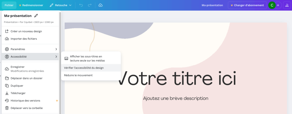 Dans Canva, le vérificateur est pour l’instant plus limité. Il propose néanmoins une base pour vérifier les contrastes et l’absence d’alternative textuelle pour les images.